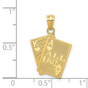 14k Gold Ace of Hearts & King of Hearts All In! Cards Pendant Charm(SIZE IN INCHES)This Charms size is: 0.89 X 0.59 inches. Item Weight in grams: 1.27 To get a good idea of the size of this item, look above for (in some instances) a second picture that shows it according to scale. For more info, please see details below, or contact me.
