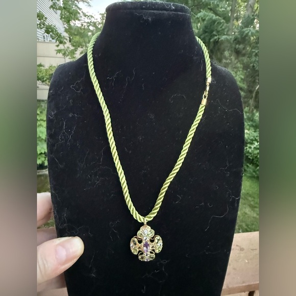 Stunning solid 14K yellow gold pendant necklace with a marquise-cut amethyst center and sparkling peridot accents. Elegant textured gold design on a green twisted cord.