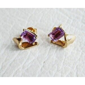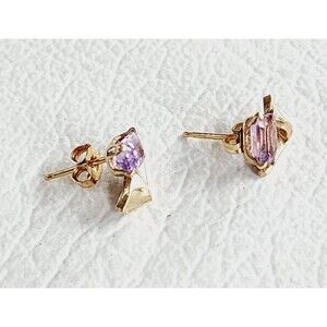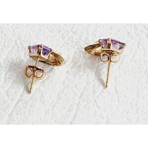 Add a touch of elegance to any outfit with these beautiful earrings from Princess Pride Creations. The amethyst stones, set in 14K gold-filled prongs, sparkle in the light and complement the flower-shaped design. These vintage earrings feature a butterfly closure and are suitable for any occasion, including Mother's Day, Christmas, graduation, wedding, anniversary, birthday, and Valentine's Day. The earrings measure 3/8 inch in length and are signed by the seller. Whether you're looking for a unique gift or a stylish addition to your jewelry collection, these earrings are sure to impress.