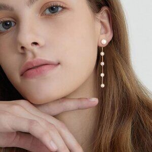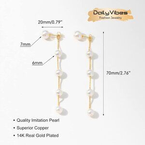 Suitable Size: This long chain gold drop earrings is hanging excellent luster 6-7mm ball white pearl, the height of drop pearl earrings is 70mm. Comfy simple gold dangling earrings can be worn every day.