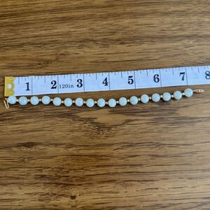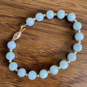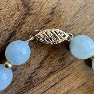 This is a beautiful vintage beaded bracelet of light green Jadeite with 14k solid yellow gold clasp and spacer beads. It has a fish hook clasp. It is 7.5 inches wearable length. Jadeite beads are approximately 8mm in diameter. It is marked 14K G.S.J. on the clasp.
