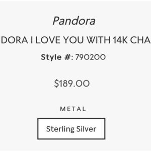 Pandora charm authentic. “I LOVE YOU” Sterling silver with 14K heart charm. Never worn.