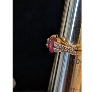 14K Gold Natural Pink Tourmaline & Diamond Criss Cross Band Ring Size 9.5. Vivid pink tourmaline (October Birthstone). The oval pink tourmaline measures approximately 8mm long by 6mm wide and is about 1.15 ct. There are 22 round diamonds on the sides totaling approximately .20 ctw with I2 in clarity and I-J in color. Total carat weight is approximately 1.35 ctw. Ring weighs 3.67 grams and is marked 14k with maker's mark. Side band is 5.2mm in width. Pre-owned, this ring is in great condition. Center stone is slightly loose and will need to be tightened by a jeweler.