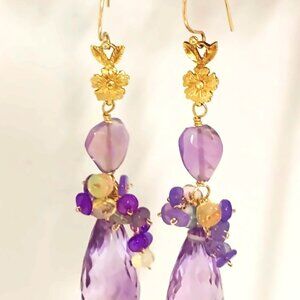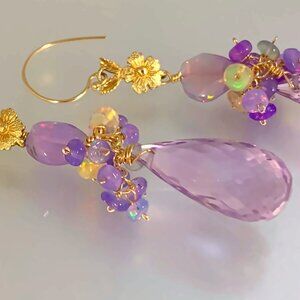 Summer hydrangeas. 18mm pink amethyst briolette is clustered with lilac opals, linked with flashy lilac opal bead and dropping from a 14k gold petite flower link. The base of earrings are ear wire for pierced ear lobe. The earrings are 2.25 inches long.