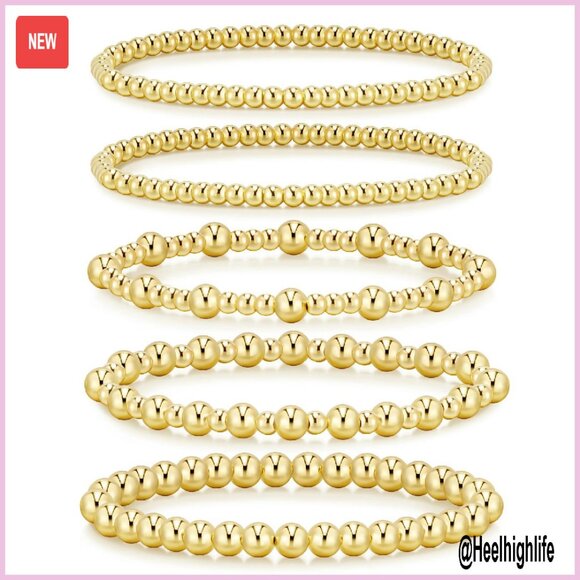 14K Gold Plated Beaded Bracelet Set Stackable Adjustable 5PCS