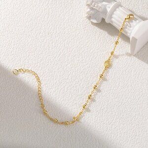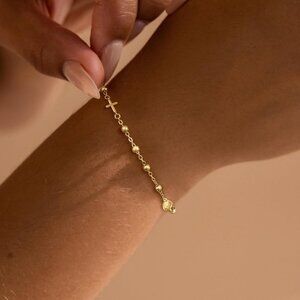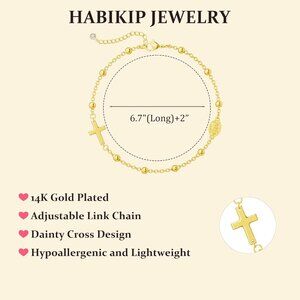 Features: Elegant cross charm shines with rich luster, stylish solo or layered. Made of 14K gold plated brass — lead-free and nickel-free, perfect for sensitive skin. Comfortable fit, secure lobster claw clasp, adjustable for most wrist sizes. Ideal for adding a subtle touch of faith and fashion.