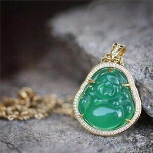 14K Gold Plated Green Jade Buddha Pendant Necklace With Lab Simulated Diamonds