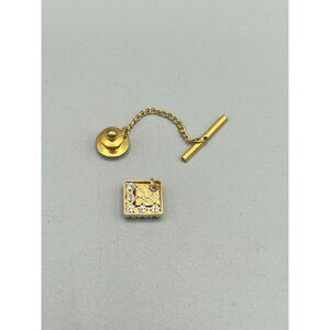 A sophisticated 14K gold tie tack, featuring an elegant square design adorned with sparkling genuine gemstones. This accessory adds a touch of refined elegance to any formal attire.