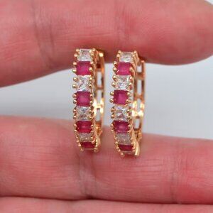 14K Gold Womens 2ct Rose Red Ruby Gemstone 1ct Diamond Small Hoop Earrings NEW