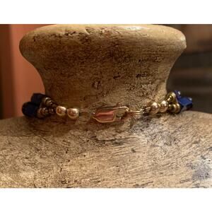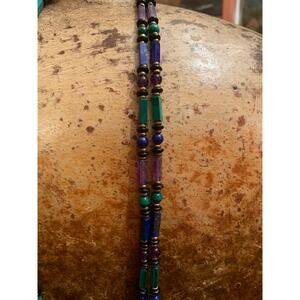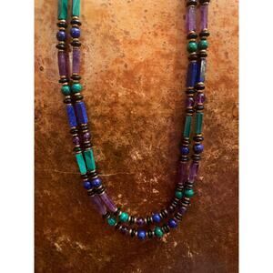 14K gold and multi stone double strand necklace. Rectangular and round beads include lapis, malachite and amethyst, rondelle are black onyx and gold tone flat round are spacers. Four beads by clasp in image 5 test as 14k gold and clasp is gold filled. Necklace measures 25 inches long.