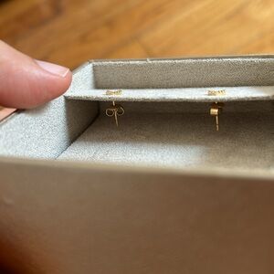 These beautiful earrings are cute and neutral for any occasion. Never been worn. Need a small cleaning to get them to really sparkle, but easy to take them anywhere to do so!