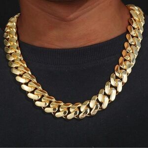 Elevate your style with this bold 14K gold-plated Cuban link chain, crafted on a durable stainless steel base for long-lasting shine and strength. Featuring a striking 14mm width and a perfect 24-inch length, this chain offers a premium, heavyweight look that stands out effortlessly.