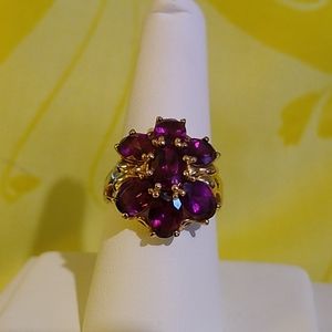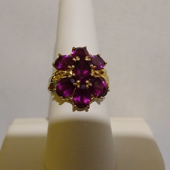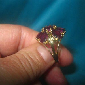 Luscious plum color stones on this beautiful 14K Yellow Gold 7-Stone Rhodolite Garnet ring. Approximate 5 ctw. Barely worn, in excellent condition. Garnet is January's beautiful birthstone. Stamped 14K. Total ring weight is 6 grams.