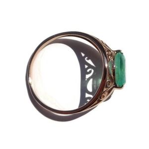 The ring is 14K rose gold, of cast manufacture and finished. The ring features an emerald set in two prongs on top of a domed mount with pierced scroll motifs.
