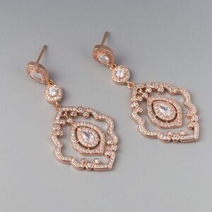 14K Rose Gold Plated Art Deco Vintage Style Dangling Drop Post Back Chandelier Statement Earrings Embellished with AAAAA Grade White Diamond Cubic Zirconia Zircons