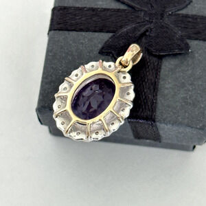 14K Solid Yellow Gold & White Gold Two Tone Amethyst Diamond Halo Oval Pendant
