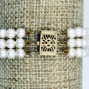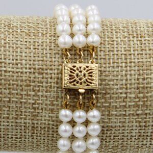 This beautiful dainty and elegant 14K yellow gold pearl bracelet is comprised of 511 genuine cultured pearls with two 14k yellow gold bar spacers in the bracelet. It is a stunning piece of fine jewelry.