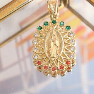 14K Virgen de Guadalupe Pendant Cubic Zirconia Figaro or Rope Chain 20"4mm