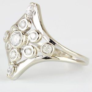 A beautiful mid-century modern styled 14 Karat ring with 11 natural diamonds. The diamond shaped ring has 9 stunning round diamonds with 2 accenting marquise diamonds at the top and bottom points of the ring. On the inside shank of the ring has a clear "14K" karat stamp along with a "WIC" hallmark. "WIC" stands for Weindling International Corp or also Weindling International LLC.