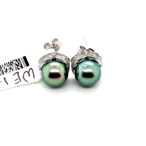 Real 14K White Gold Cultured Tahitian Pearl/Diamond Stud Earrings, NOT GOLD PLATED OR GOLD FILLED.