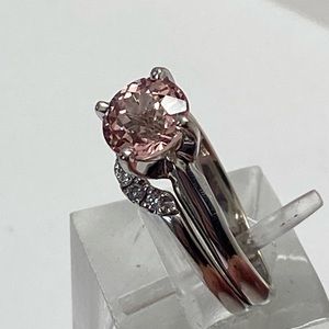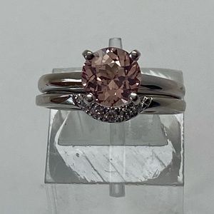 Set very securely in the center of this classic setting is a natural morganite gemstone. The morganite has a rich peach pink color and is eye clean with beautiful faceting. The 7mm gemstone is set with four prongs and sits 5/16" off of your finger. The setting is a Jared's Chosen mounting and is stamped with both trademarks on the inside of the band. There is a perfectly matching curved wedding band that fits right up against the morganite engagement ring. There are 5 natural white diamond set in the curve. Small stones but bright white goods! Both bands are soldered together which is nice because you don't have to worry about them spinning. Together, the bands measure 4mm. It is a very comfortable set to wear! Both rings have a shiny high polished finish and would be easy to size up or down. (locally) currently a finger size 5. They are solid white gold and stamped 14K. I have cleaned them in the ultrasound and polished them on the buffing wheel. They were well cared for and in very good preowned condition. A beautiful twist on the classic solitaire look!