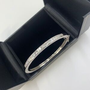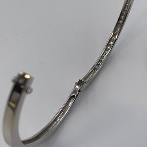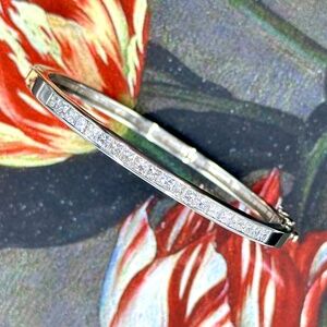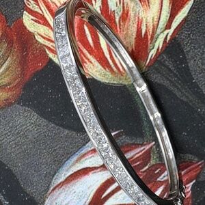 This is a very beautiful bangle bracelet I had custom-made by Mordechai at The Jewelers of Las Vegas. However, the diamonds he used were from a ring I purchased at Bailey, Banks & Biddle in San Diego, CA. My then husband who had been friends with Mordechai for over 30 years, took the Bailey, Banks & Biddle ring to him and asked him to create something out of them. They agreed a straight, channel set bracelet would show off the calibrated diamonds to their fullest and protect the corners of the square diamonds. This lovely bangle in white gold was the finished product. When I was presented with it, I was very pleased. I like the fact it is a hinged design instead of the style that you have to push over your hand since those are always too big. This one sits perfectly on the wrist due to the oval design. It closes with a secure "click", then there are two clasps to secure the bracelet so you can wear it trouble free. The twenty diamonds are all FG color, VS2 quality. The bracelet will come to you in a presentation box with an LED light that shines a light on the diamonds.
