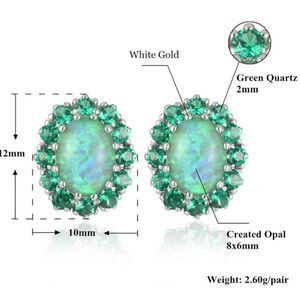 14K White Gold Plated Silver Tone Oval Post Back Stud Earrings Embellished with 8mmx 6mm Oval Cut 100% Genuine Green Fire Opals and 2mm Round Cut Green Quartz