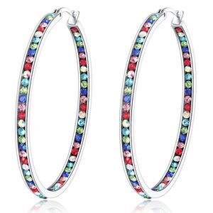 Large 14K White Gold Plated 316L Silver Stainless Steel Round Hoop Latch Back Earrings Embellished with 2x2mm Round Cut Multicolored Cubic Zirconia CZ Zircons in Blue Sapphire, Pink Sapphire, Ruby Red, Peridot Green, Aquamarine Blue, Iridescent AB (Aurora Borealis), Etc.