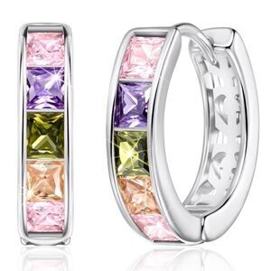 14K White Gold Plated Silver Tone Round Hoop Huggies with Hinged Snap Latch Closure Earrings Embellished with Square Princess Cut Multi Color Cubic Zirconia CZ Zircons in Pink Sapphire, Purple Amethyst, Peridot Green and Peach Morganite