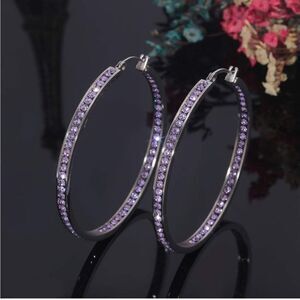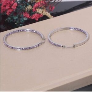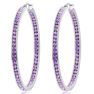Large 14K White Gold Plated 316L Silver Stainless Steel Round Hoop Latch Back Earrings Embellished with 2x2mm Round Cut Purple Amethyst Cubic Zirconia CZ Zircons