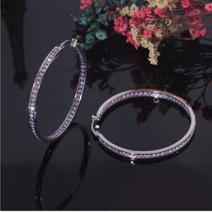 14K White Gold with Purple Amethyst Cubic Zirconia Big Hoop Latch Back Earrings
