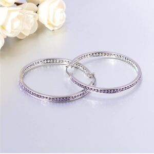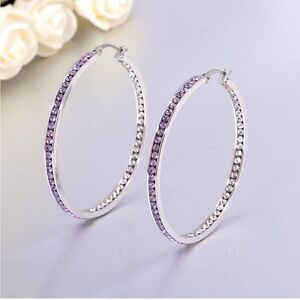 Large 14K White Gold Plated 316L Silver Stainless Steel Round Hoop Latch Back Earrings Embellished with 2x2mm Round Cut White Diamond and Purple Amethyst Cubic Zirconia CZ Zircons