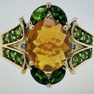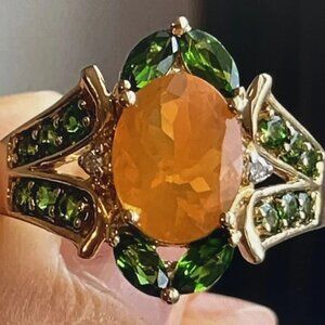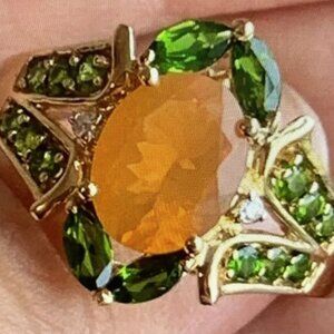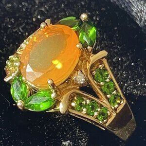 14K YELLOW GOLD FIRE OPAL AND TSAVORITE GARNET STUNNING RING SIZE 6