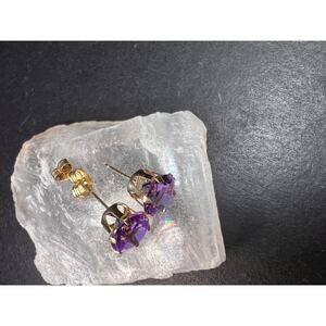 Pre owned, like new 14k yellow gold stud earrings set with vibrant color-shift CZ stones that flash purple, violet, pink, and blue in different lighting. The stones measure about 8.2mm each and sit in classic six-prong crown settings that give them a ton of sparkle. The earrings weigh 1.28 grams total, and that includes the stones and the single original 14k ear back. One ear back is original and stamped F1 14K to match the posts; the other back was replaced and is gold filled. The stones and settings are clean and bright with only very light wear. A bold, eye-catching pair with beautiful color play.