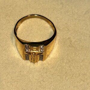 This exquisite 14K yellow gold crucifix ring features a detailed cross with small diamond accents, adding a touch of sparkle to its elegant design. The ring is stamped with '14K SD' to signify its authenticity and craftsmanship. Sized approximately 13-13.5 on the ring sizer, this piece combines faith with sophistication, making it a meaningful addition to any jewelry collection . 14k gold Tested , 6.93 grams