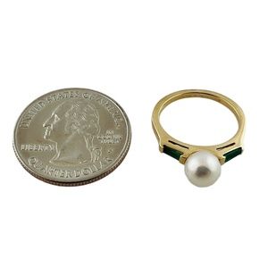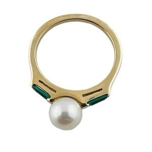 14K Yellow Gold Cultured Pearl Lab Created Emerald Ring Size 5 #15676