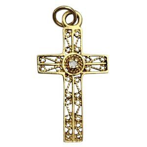14K Yellow Gold Diamond Chip Filigree Cross Pendant C463