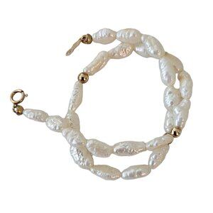 Indulge yourself with something delightful to enjoy, little treasures like this 14K Yellow Gold Knotted Rice Pearl Bracelet. This delicate Rice Pearl Bracelet is crafted with glossy rice pearls strung together with polished gold bead intervals. It measures 8 inches in total length. Fastens with a 14K Yellow gold clasp and spring ring closure marked 14K. This is a perfect strand of pearls to adorn your wrist. It is comfortable and lightweight - perfect for daily wear. Stack it with other gold chain bracelets for gorgeous texture contrast.