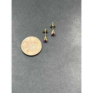 Beautiful pair of 14K yellow gold stud earrings featuring genuine natural rubies in classic 4-prong settings. Each ruby measures 3mm round with approximately 0.25 total carat weight for the pair. Total earring weight is 0.43 grams. These elegant studs showcase vibrant red rubies with excellent color saturation and clarity. Perfect for daily wear, July birthstone gift, or special occasions. Secure butterfly backs included.