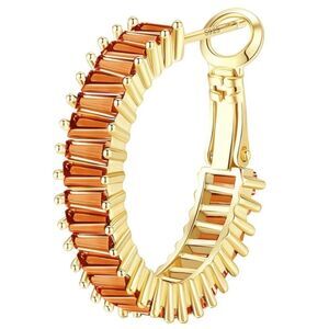 14K Yellow Gold Plated and 925 Sterling Silver Post Hinged Lever Back Round Drop Hoop Earrings Embellished with Tapered Baguette Cut Burnt Orange Topaz AAAAA+ Grade Cubic Zirconia CZ Zircons
