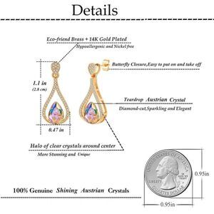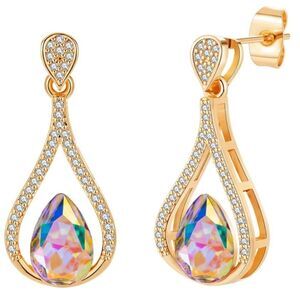 14K Yellow Gold Plated Hollow Halo Teardrop Dangling Drop Post Back Earrings Embellished with Teardrop and Round Cut Iridescent AB (Aurora Borealis) and White Diamond Austrian Crystals
