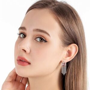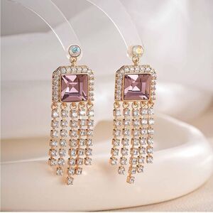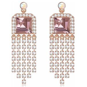 14K Yellow Gold Plated Halo Square Drop Dangling Tassel Post Back Earrings Embellished with Square and Round Cut Pink Sapphire, Iridescent AB (Aurora Borealis) and White Diamond Austrian Crystals
