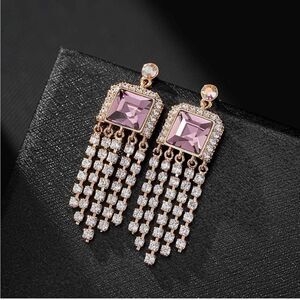 14K Yellow Gold with Pink Sapphire Austrian Crystal Dangling Tassel Earrings
