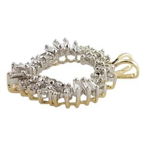 This beautiful heart pendant features 11 baguette cut diamonds and 27 round cut diamonds all set in 14K white gold with a yellow gold back!