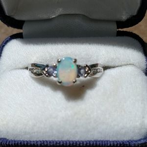 This is the most beautiful classic and unusual blue opal ring in 14K white gold. The wonderful colors of the opal could not be captured, but it is so pretty. It is so elegant and has perfect dimensions. It is just a classic and is very comfortable to wear. I receive a lot of comments on this ring, it has so many intricate details. It goes with everything and is elegant for a night out and classic to wear to work every day. Since this ring is 14k white gold, it will retain its value over the years.