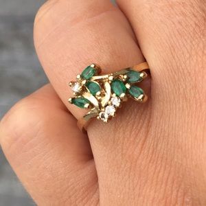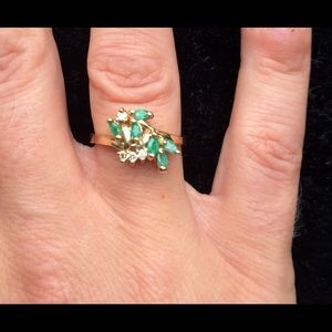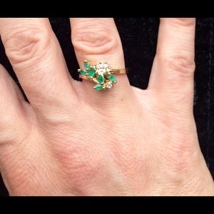 6 emeralds & 4 diamonds set in 14k yellow gold. Size 6.25. I just don’t wear gold anymore.