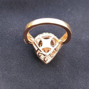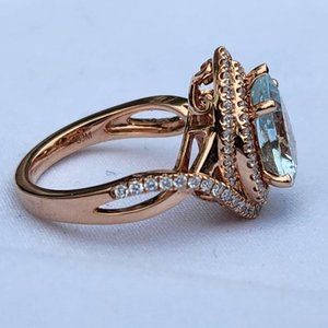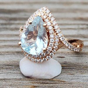 Beautiful ring with pear cut shape aquamarine 2CT stone, double diamond halo in 14K rose gold.