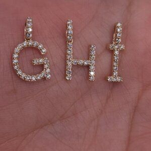 This is a beautiful initial letter Lab Grown diamond design necklace. It is set in real solid 14Kt Gold. The Pendant and chain are both 14Kt Gold. You can choose if you want 14Kt White Gold, 14Kt Yellow Gold or 14Kt Rose Gold.
