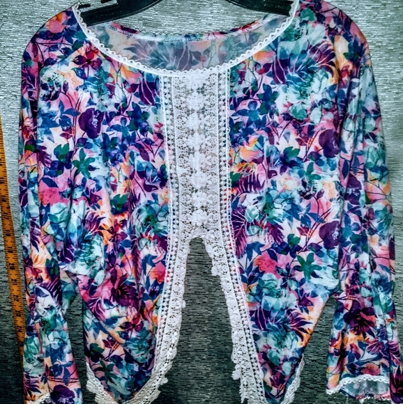 Back has an opening with lace all around the bottom, base for a swimsuit cover or with jeans and a tank.