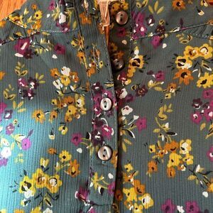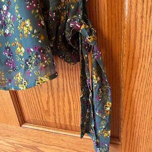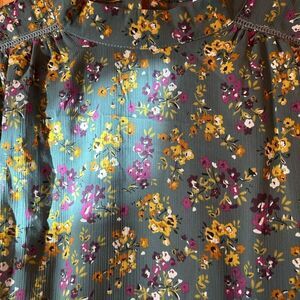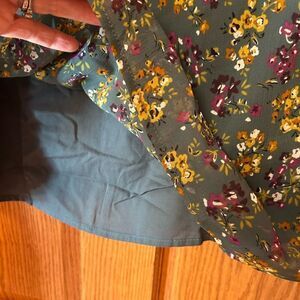 Size 14W long sleeve gray with gold maroon floral pattern. Button high collar with tie at wrists. Lined with cotton.